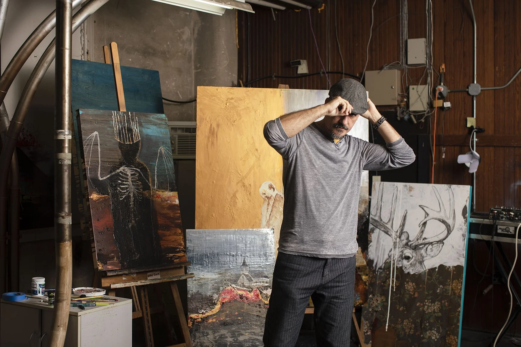 “I don't know if there's an underlying message in my work. I'd much rather the viewer come to their own opinions regarding my messaging, something that I think helps bring them back to the work. So, with this in mind, I tend to be purposefully vague with any reoccurring themes. But with that said, there are certainly topics that thread throughout my work. As I mentioned before, the human connection to nature, God, ourselves and each other are probably the most common themes in my work. I touch on the duality of man a lot - the animal inside of us all - sometimes I do this literally by using animal imagery. I like to focus on transition, meaning that most of us are in a state of constant flux - capturing that idea in a painting is important to me and one that I think other's relate to. Oh, and I would be remiss if I didn't mention my own heritage and the reinterpretation of what I think Southern Gothic means. It's probably only been in the last 10 to 15 years that I began to understand the importance of using the world I grew up in as a source of inspiration. I tend to use deer and hunting culture in my work because it's such a big part of the area where I live. Personally, that culture has evaded me but that's exactly what makes my perspective on it unique. So, I definitely dive into that and have probably had my biggest success doing so.”