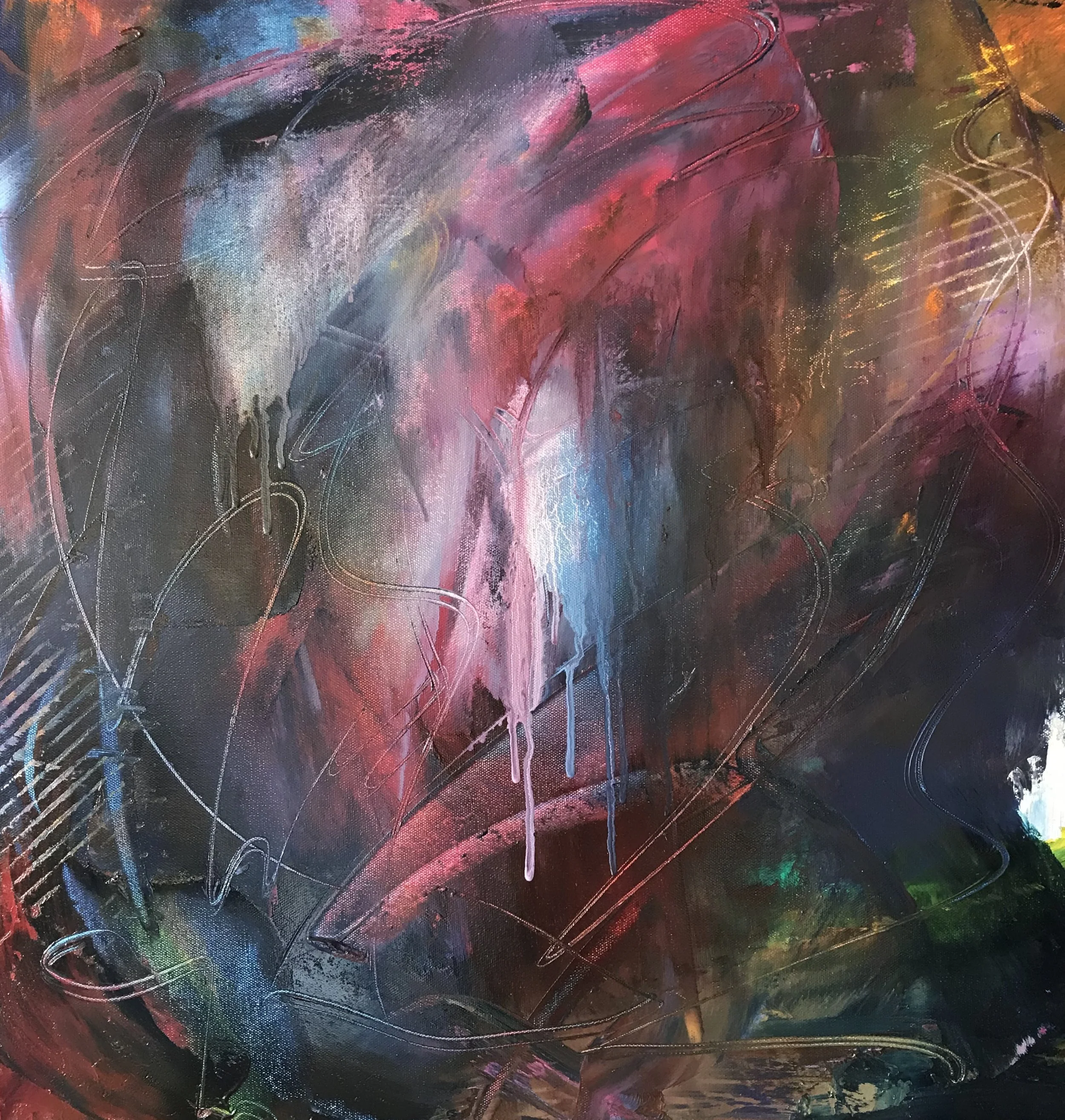 “To activate a blank canvas, I begin making marks with pastel oil sticks, oil sticks, acrylic paint, ink, pencils and/or markers. I then respond to those marks by adding paint (acrylic or oil). I may move that paint around with compressed air or various tools. I sometimes add mixed media such as marble dust or crushed walnut shells. I enjoy pressing paper towels into the wet paint to blend colors together. Lately, I have used saran wrap over the wet paint to move it around and get special effects. Essentially, I keep layering to achieve depth and interest until I am somewhat satisfied.”